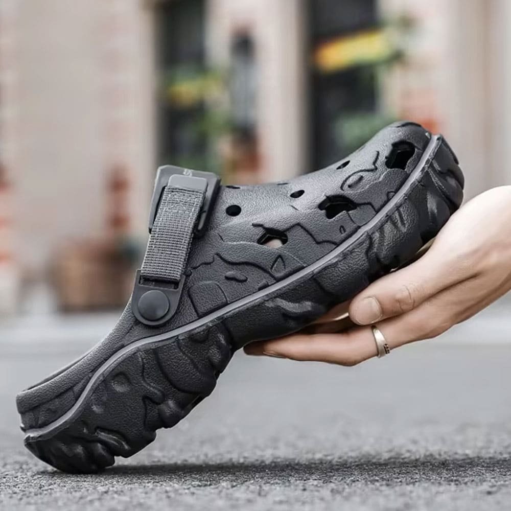 Poczuj wyjątkowy komfort i wytrzymałość dzięki naszym Czarnym taktycznym Crocsom. Zaprojektowane z myślą o letnich aktywnościach na świeżym powietrzu, te klapki o gładkim wzorze i niskim obcasie wykonane z materiału EVA gwarantują idealne dopasowanie i odporność na różnorodne warunki terenowe. Doskonałe na wypoczynek, staną się niezawodnym towarzyszem każdej outdoorowej wyprawy.