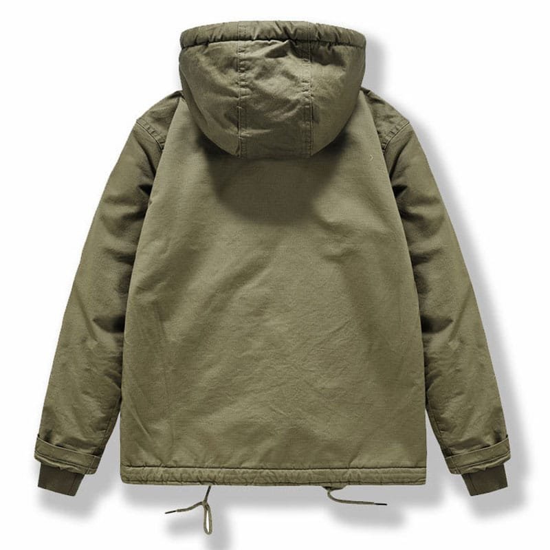 Kurtka militarna vintage z kapturem to idealne połączenie praktyczności i modnego designu. Solidna i wszechstronna, wyposażona w praktyczny kaptur i ponadczasowy fason, zapewni Ci komfort i styl podczas każdej przygody.