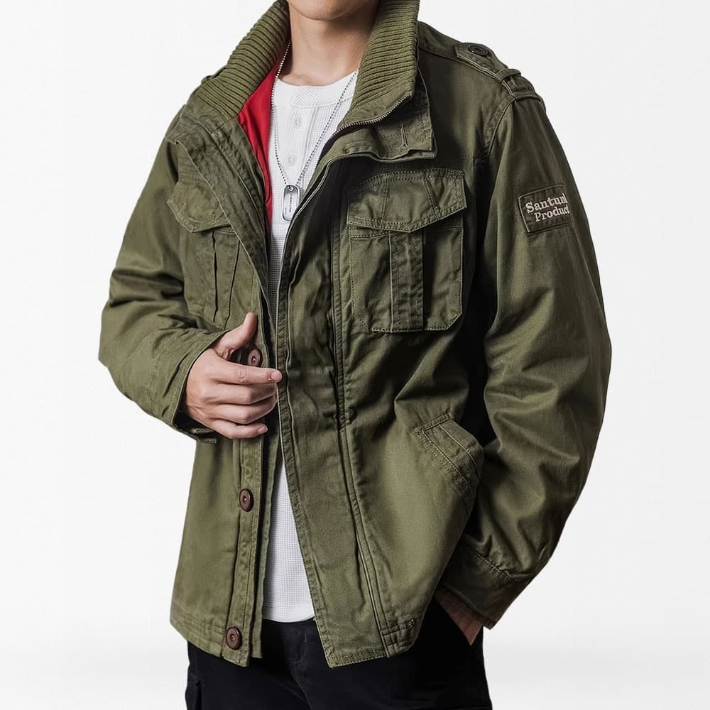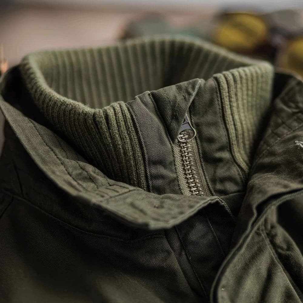- Klasyczny kołnierz z klapą: Dodaje militarny, ponadczasowy wygląd, podkreślając design kurtki.